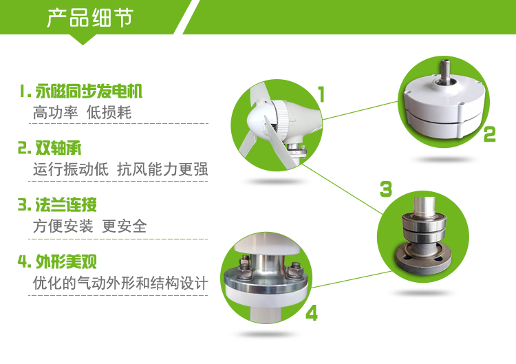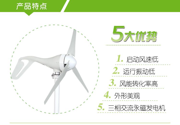 4、發(fā)電機采用專利技術的永磁轉子交流發(fā)電機,配以特殊的轉子設計,有效地降低發(fā)電機的阻轉矩,僅為普通電機的1/3,同時使風輪與發(fā)電機具有更為良好的匹配特性,機組運行的可靠性。
