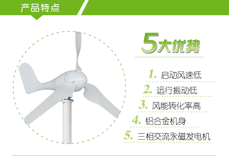 4、發(fā)電機(jī)采用專利技術(shù)的永磁轉(zhuǎn)子交流發(fā)電機(jī),配以特殊的轉(zhuǎn)子設(shè)計,有效地降低發(fā)電機(jī)的阻轉(zhuǎn)矩,僅為普通電機(jī)的1/3,同時使風(fēng)輪與發(fā)電機(jī)具有更為良好的匹配特性,機(jī)組運行的可靠性。