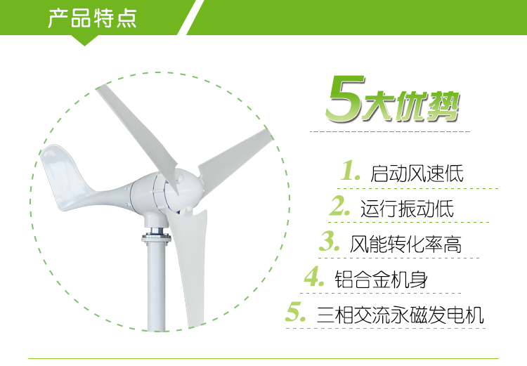 4、發(fā)電機(jī)采用專利技術(shù)的永磁轉(zhuǎn)子交流發(fā)電機(jī),配以特殊的轉(zhuǎn)子設(shè)計(jì),有效地降低發(fā)電機(jī)的阻轉(zhuǎn)矩,僅為普通電機(jī)的1/3,同時(shí)使風(fēng)輪與發(fā)電機(jī)具有更為良好的匹配特性,機(jī)組運(yùn)行的可靠性。