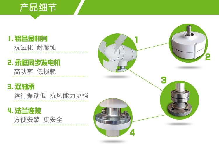 3、風(fēng)輪葉片采用尼龍纖維材質(zhì),配以優(yōu)化的氣動(dòng)外形設(shè)計(jì)和機(jī)構(gòu)設(shè)計(jì),啟動(dòng)風(fēng)速低,風(fēng)能利用系數(shù)高,增加了年發(fā)電量;