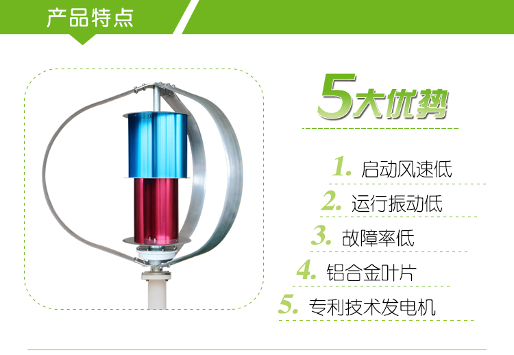 4、發(fā)電機采用專利技術(shù)的永磁轉(zhuǎn)子交流發(fā)電機,配以特殊的轉(zhuǎn)子設(shè)計,有效地降低發(fā)電機的阻轉(zhuǎn)矩,僅為普通電機的1/3,同時使風(fēng)輪與發(fā)電機具有更為良好的匹配特性,機組運行的可靠性。