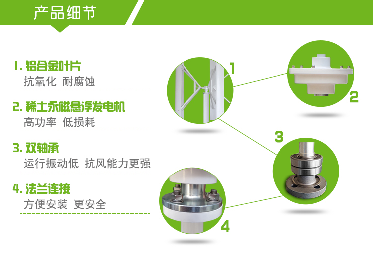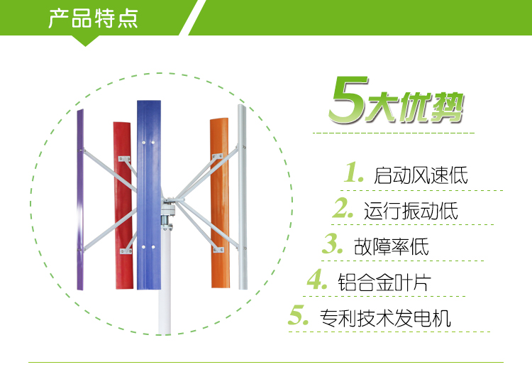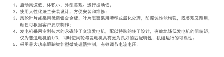 4、發(fā)電機(jī)采用專利技術(shù)的永磁轉(zhuǎn)子交流發(fā)電機(jī),配以特殊的轉(zhuǎn)子設(shè)計,有效地降低發(fā)電機(jī)的阻轉(zhuǎn)矩,僅為普通電機(jī)的1/3,同時使風(fēng)輪與發(fā)電機(jī)具有更為良好的匹配特性,機(jī)組運(yùn)行的可靠性。