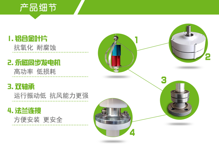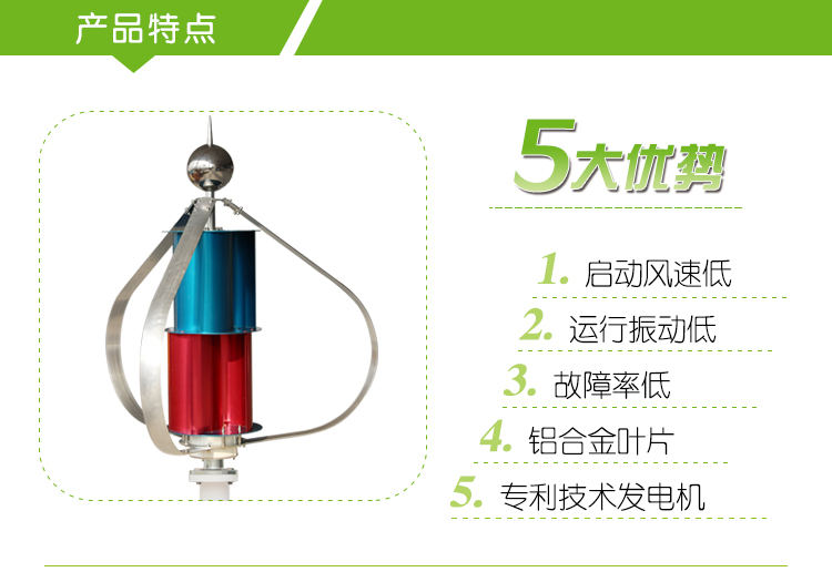 4、發(fā)電機采用專利技術(shù)的永磁轉(zhuǎn)子交流發(fā)電機,配以特殊的轉(zhuǎn)子設(shè)計,有效地降低發(fā)電機的阻轉(zhuǎn)矩,僅為普通電機的1/3,同時使風(fēng)輪與發(fā)電機具有更為良好的匹配特性,機組運行的可靠性。