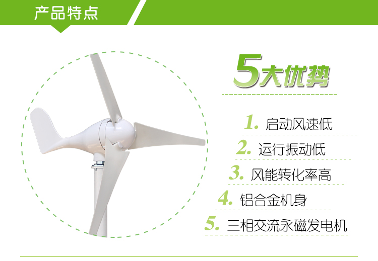 3、風(fēng)輪葉片采用尼龍纖維材質(zhì),配以?xún)?yōu)化的氣動(dòng)外形設(shè)計(jì)和機(jī)構(gòu)設(shè)計(jì),啟動(dòng)風(fēng)速低,風(fēng)能利用系數(shù)高,增加了年發(fā)電量;