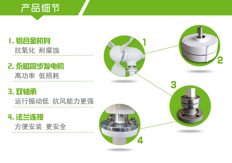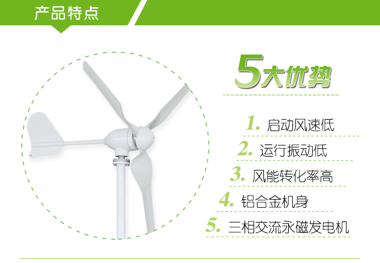 3、風(fēng)輪葉片采用尼龍纖維材質(zhì),配以優(yōu)化的氣動(dòng)外形設(shè)計(jì)和機(jī)構(gòu)設(shè)計(jì),啟動(dòng)風(fēng)速低,風(fēng)能利用系數(shù)高,增加了年發(fā)電量;